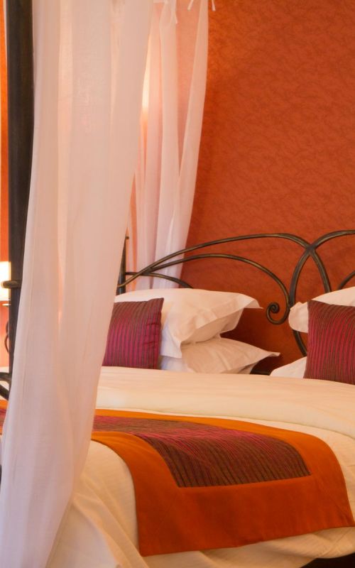 Chambre cosy et élégante. Le lit à baldaquin nous berce dans une atmosphère fastueuse et reposante. Sur le balcon, vous apprécierez déguster un verre de vin entre géraniums et colombages.